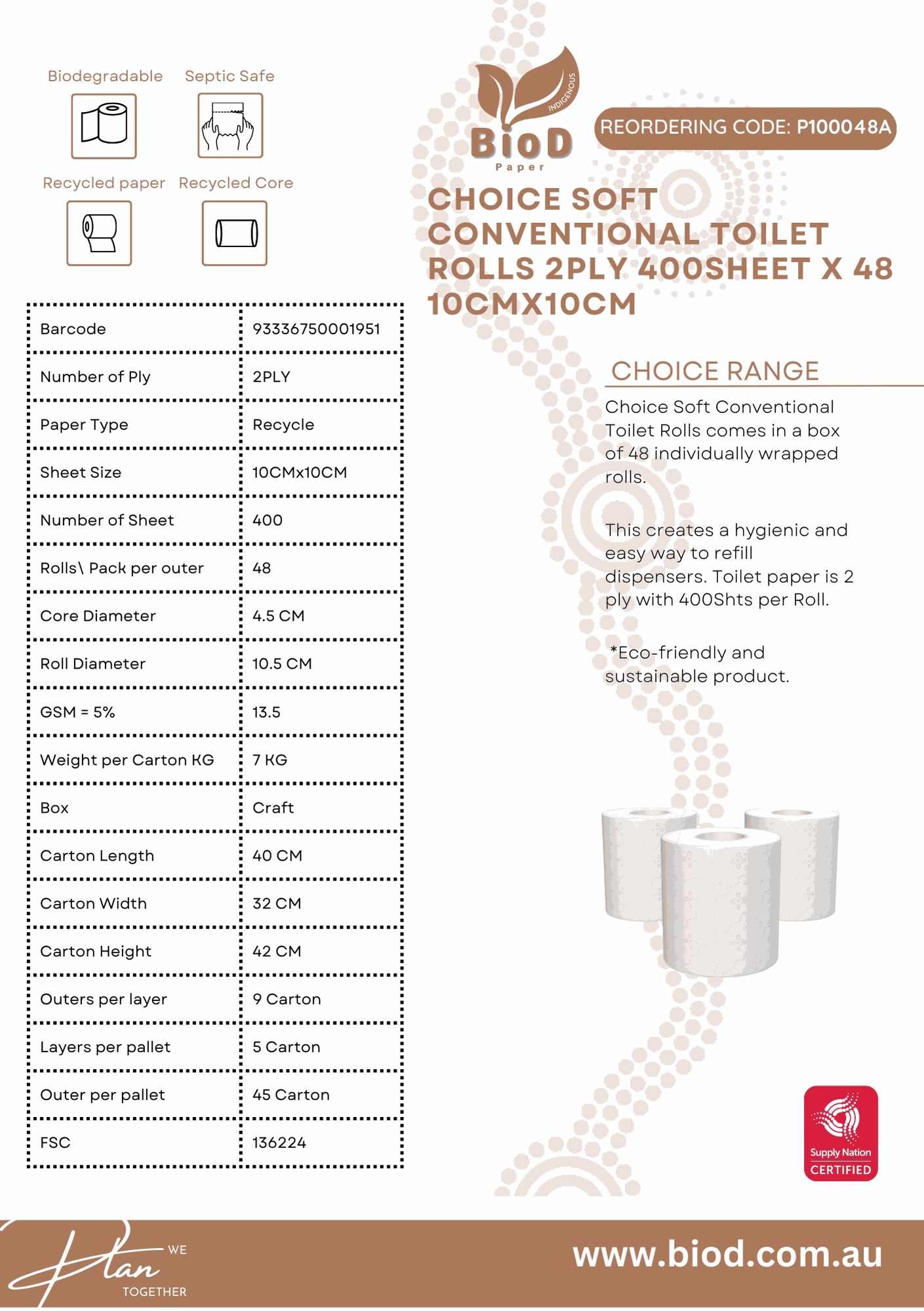 BIOD - CHOICE SOFT CONVENTIONAL TOILET ROLLS 2PLY 400SHEET X 48 10CMX10CM
