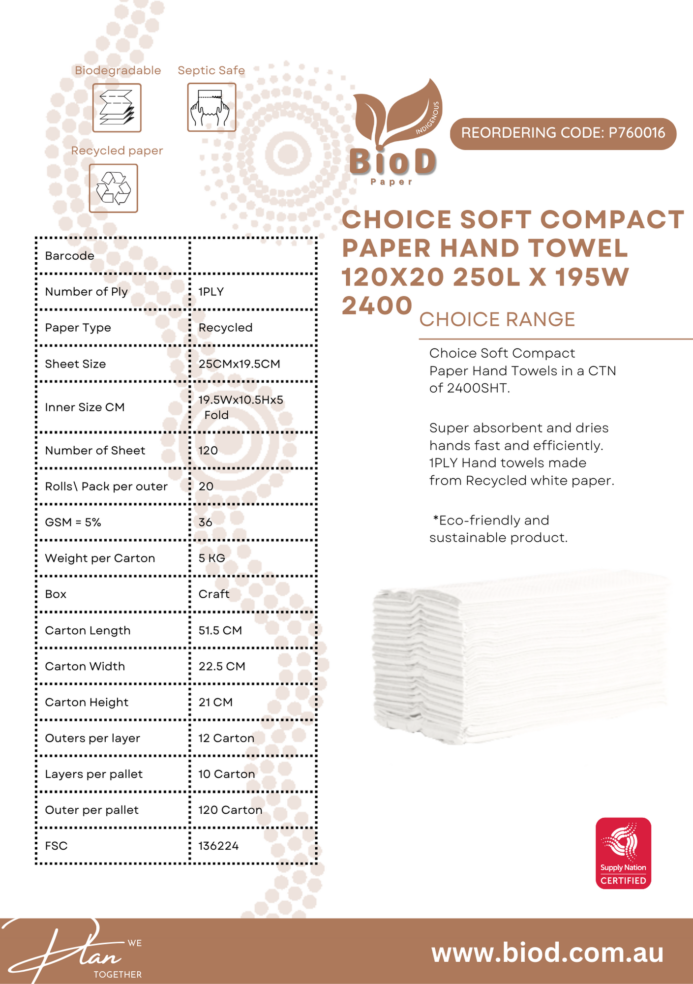 BIOD - CHOICE SOFT COMPACT PAPER HAND TOWEL 120X20 250L X 195W 2400